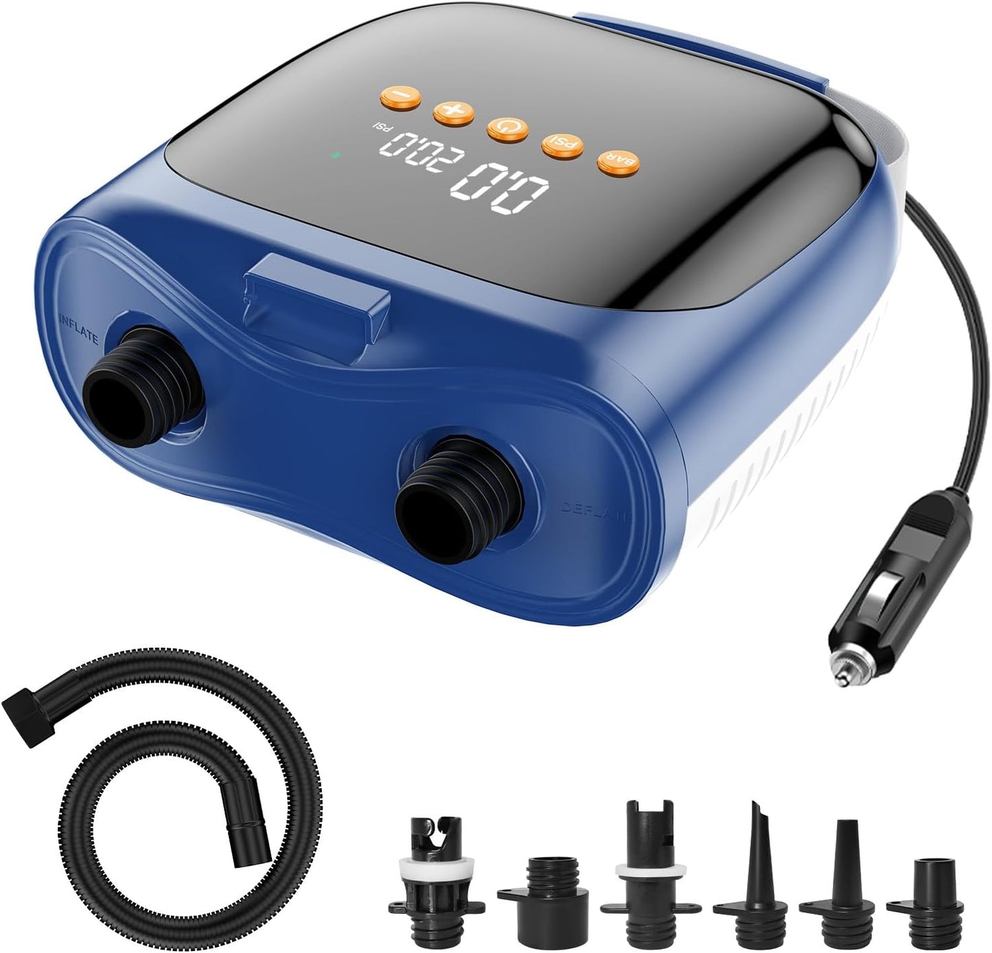 - 【20PSI High Efficiency Paddleboard Pump】With up to 20 PSI of pressure, this electric pump is perfect for use on high-pressure inflatables and can quickly inflate stand up paddle board, tent and other inflatables in 10-15 minutes, and can also fully deflate them in minutes. In the hot summer, use this paddleboard pump of ours to save you from the sweat and physical effort of hand pumping. The high pressure paddleboard pump allows you to free your hands and save your physical strength.